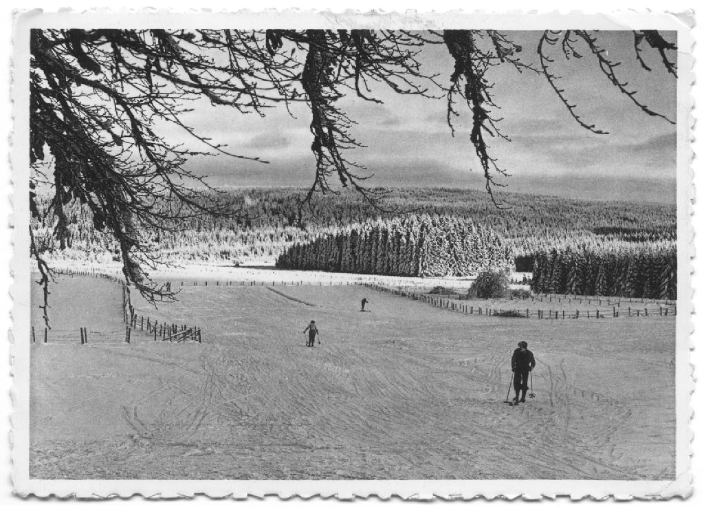 La carte postale représente un paysage hivernal avec des personnes faisant du ski de fond