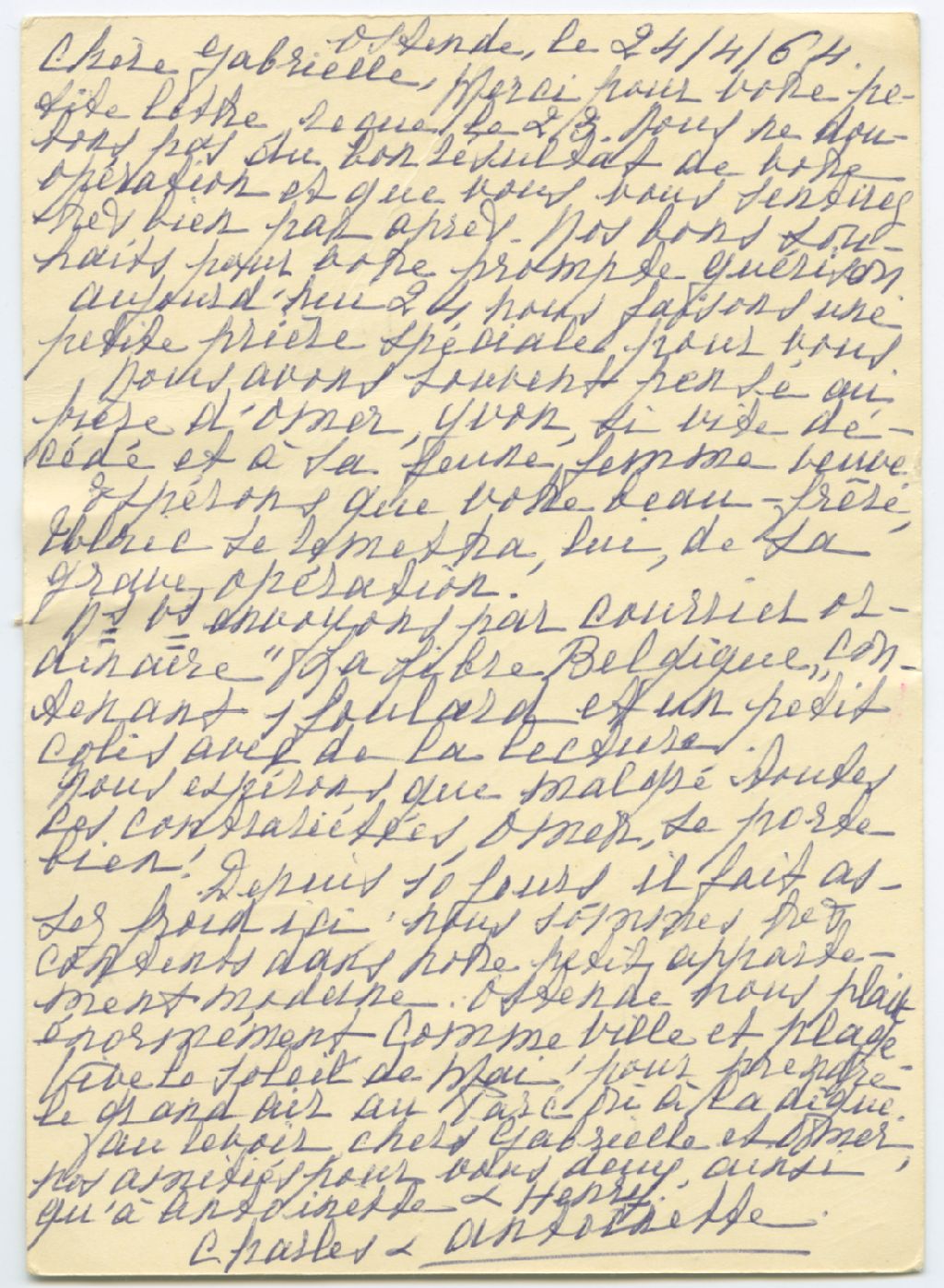 Correspondance de Charles et Antoinette de Bruyne à Omer et Gabrielle Ratté (Pellerin), 24 avril 1963, 24 avril 1964, Archives nationales à Rimouski, Fonds Gabrielle Pellerin, (01R,P29,D539), De Bruyne, Charles.