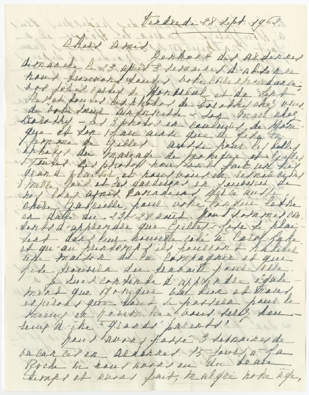 Lettre d'Antoinette de Bruyne, 28 septembre 1962, Archives nationales à Rimouski, Fonds Gabrielle Pellerin, (01R,P29,D516,P1).