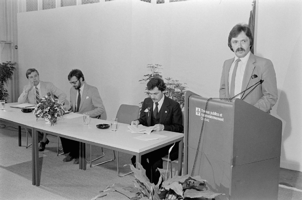 Conférence de presse de Alain Marcoux au Bois de Coulonge, 1982-05, Archives nationales à Québec, Fonds Ministère des Communications, (03Q,E10,S44,SS1,D82-310), Marc Lajoie.