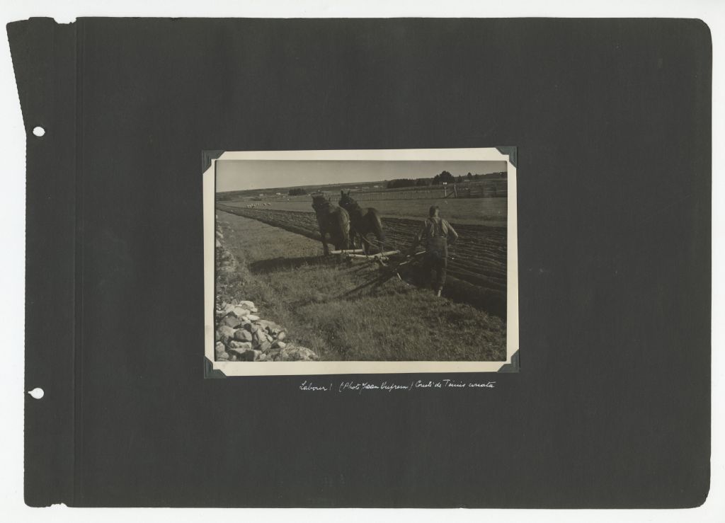 - Nous retrouvons dans cette page d'album une image du labourage des terres dans le comté de Témiscouata, à l¿aide d¿un araire et de deux chevaux.