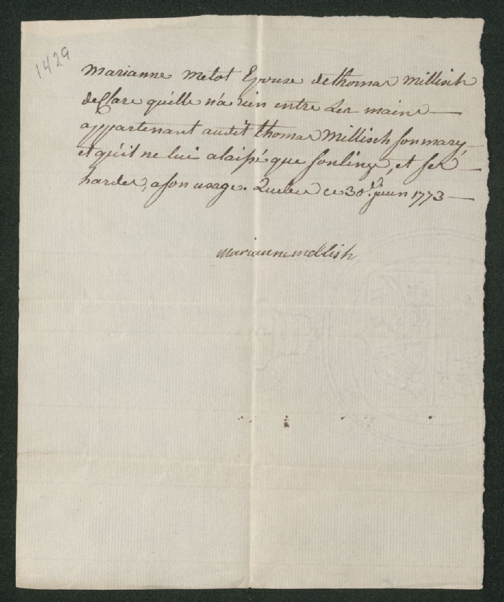 - Ce dossier en matières civiles provient de la Cour des plaidoyers communs. Il comprend; une requête de Alex Lawson, réclamant au sieur Mellish, une somme de 104 livres et 9 sols, en argent de Québec, à propos d'une hypothèque; témoignage de Joseph Metot (Methot) en défense du sieur Mellish; un témoignage de Marianne Mellish en défense du sieur Mellish; un mandat d'assignation pour former le jury; une liste des personnes sommées pour constituer le jury dans le procès; une liste des témoins du procès; le verdict du jury condamnant le sieur Mellish à payer au sieur Lawson la somme de 149 livres, 14 shillings et 3 sols, en argent de Québec; liste des témoins du procès