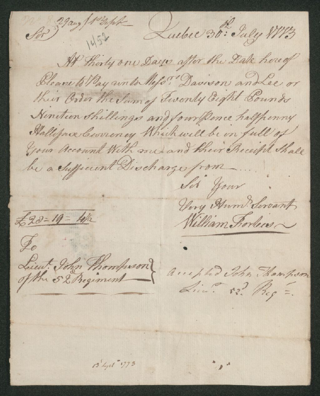 Procès entre William Forbes, soldat du 52e régiment d'infanterie (52nd regiment of foot), d'une part, et John Thompson, lieutenant du 52e régiment d'infanterie (52nd regiment of foot), d'autre part, à propos d'une dette impayée