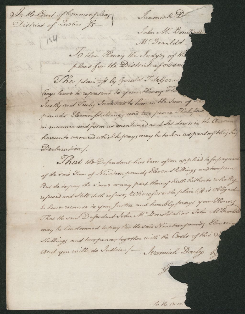 - Ce dossier en matières civiles provient de la Cour des plaidoyers communs. Il comprend une requête du sieur Jeremiah Daily, à propos d'une dette à payer par le sieur McDonald, réclamant 19 livres, 11 shillings et 2 sols, en argent d'Halifax; 2 états de compte