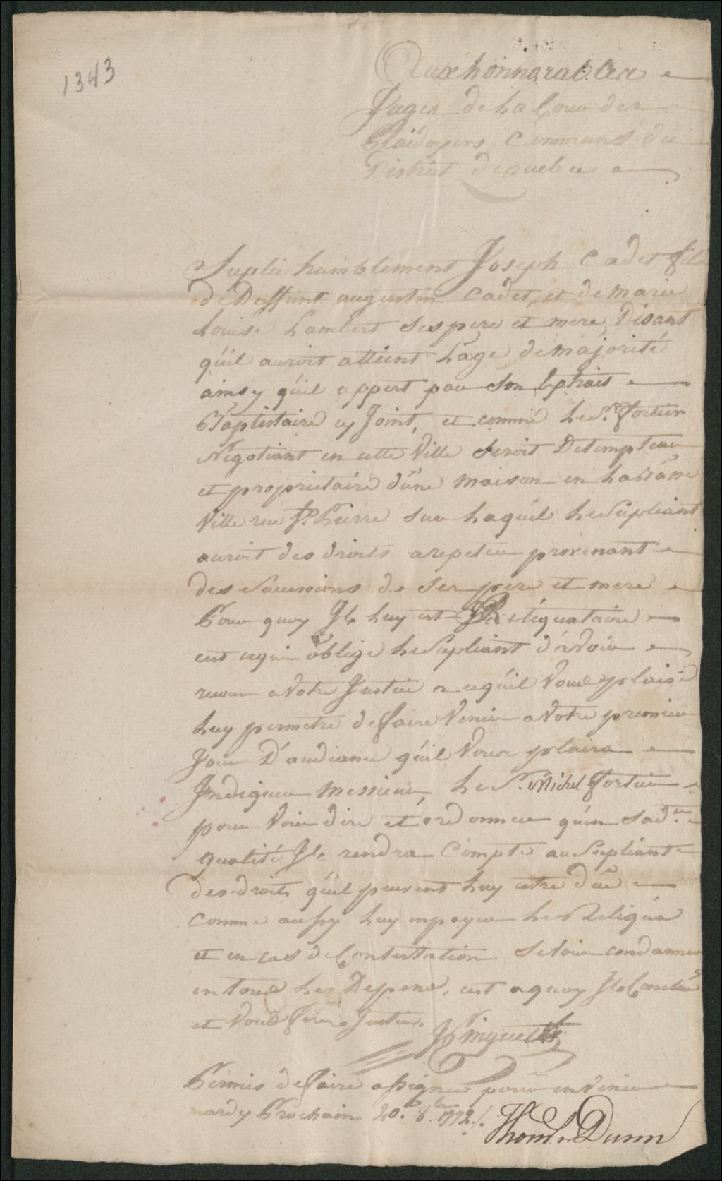 Procès entre Joseph Cadet fils des défunts Augustin Cadet et de Marie Louise Lambert, d'une part, et le sieur Michel Fortier, négociant de Québec, d'autre part, à propos d'une maison que ledit demandeur aurait droit par son âge majeur, 20 octobre 1772, Archives nationales à Québec, Fonds Cour des plaidoyers communs du district de Québec, (03Q,TL24,S1,D1343).