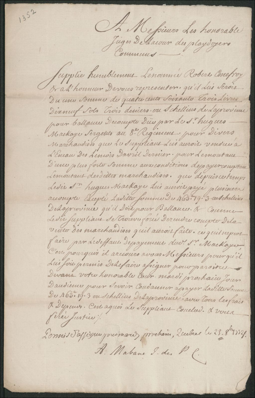 - Ce dossier en matières civiles provient de la Cour des plaidoyers communs. Il comprend une requête de la part de Robert Conefroy réclamant une somme de 473 livres, 19 sols, 3 deniers ou shillings en argent de Québec pour la balance du compte dû par Hugues Mackay pour des biens vendus lors de l'encan public de chez le sieur Renaud; une liste de biens achetés par le sieur Mackaye lors de l'encan