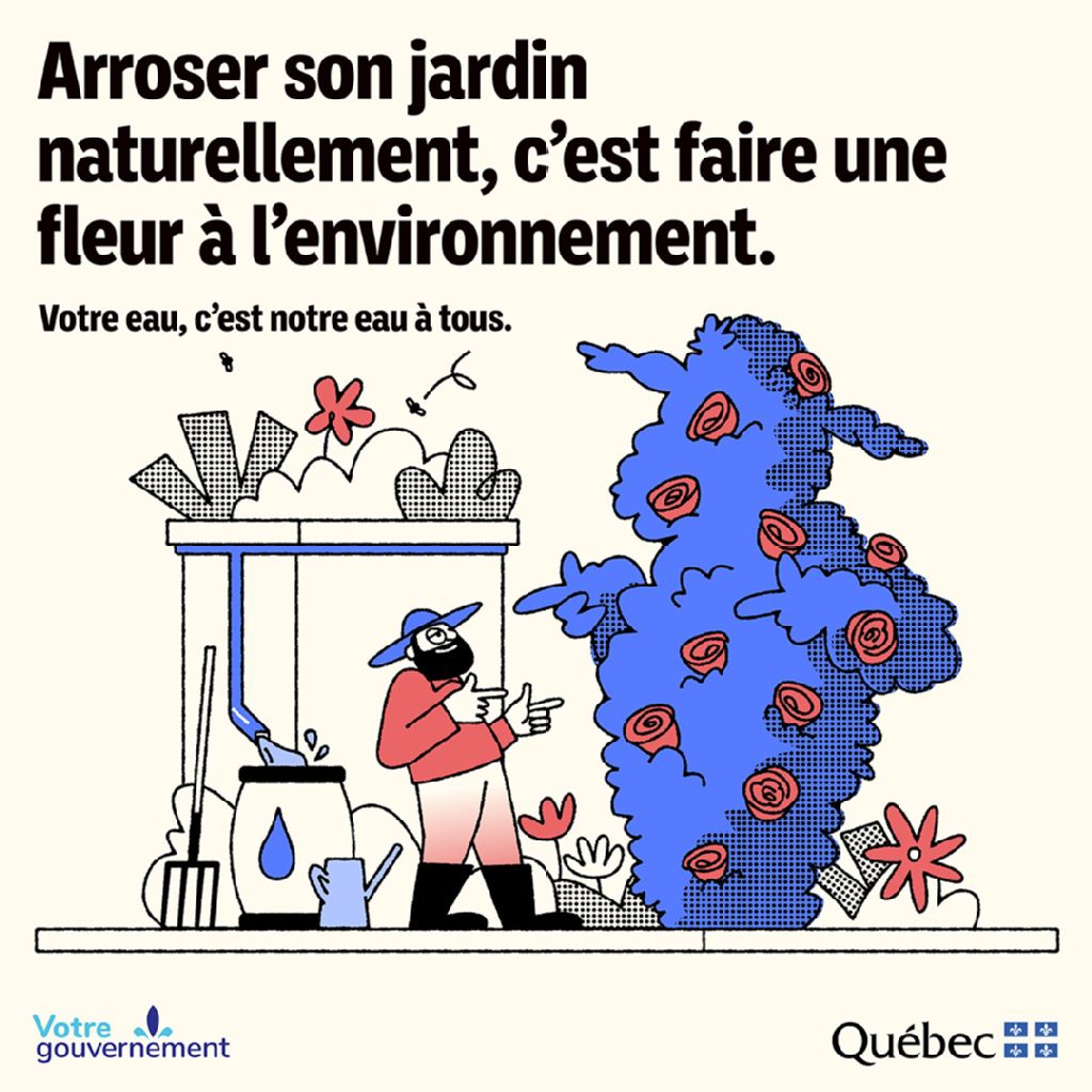 Arroser son jardin naturellement, c'est faire une fleur à l'environnement. Votre eau, c'est notre eau à tous, Votre gouvernement, Québec, [2024]