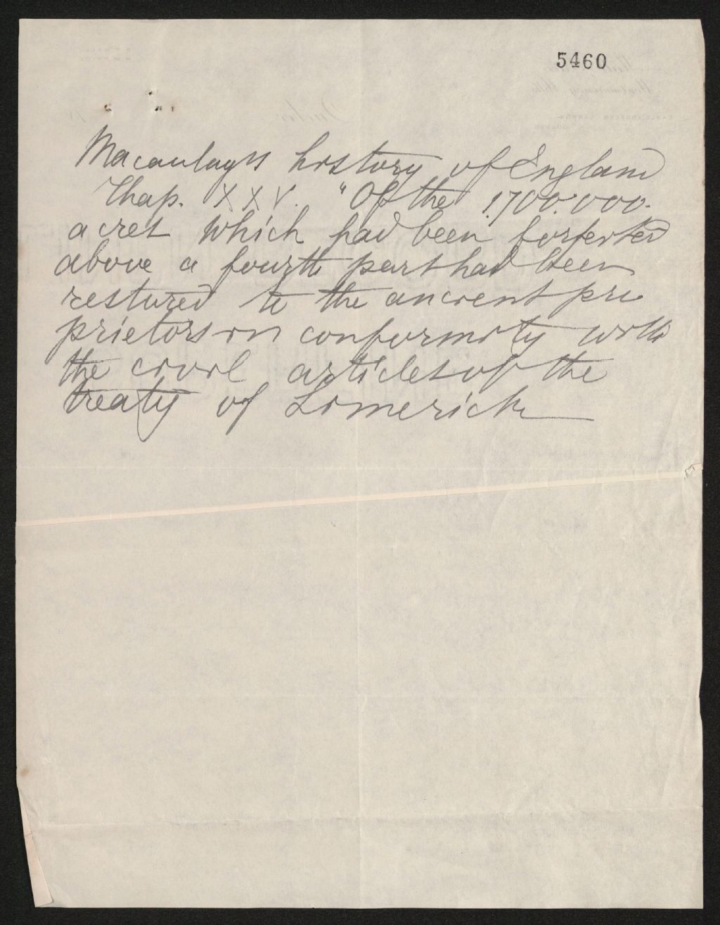 Note de Henri-Gustave Joly prise dans l'Histoire de l'Angleterre de Macaulay, vers 1890, Archives nationales à Québec, Fonds Famille Joly de Lotbinière, (03Q,P351,S4,SS1,P5460).