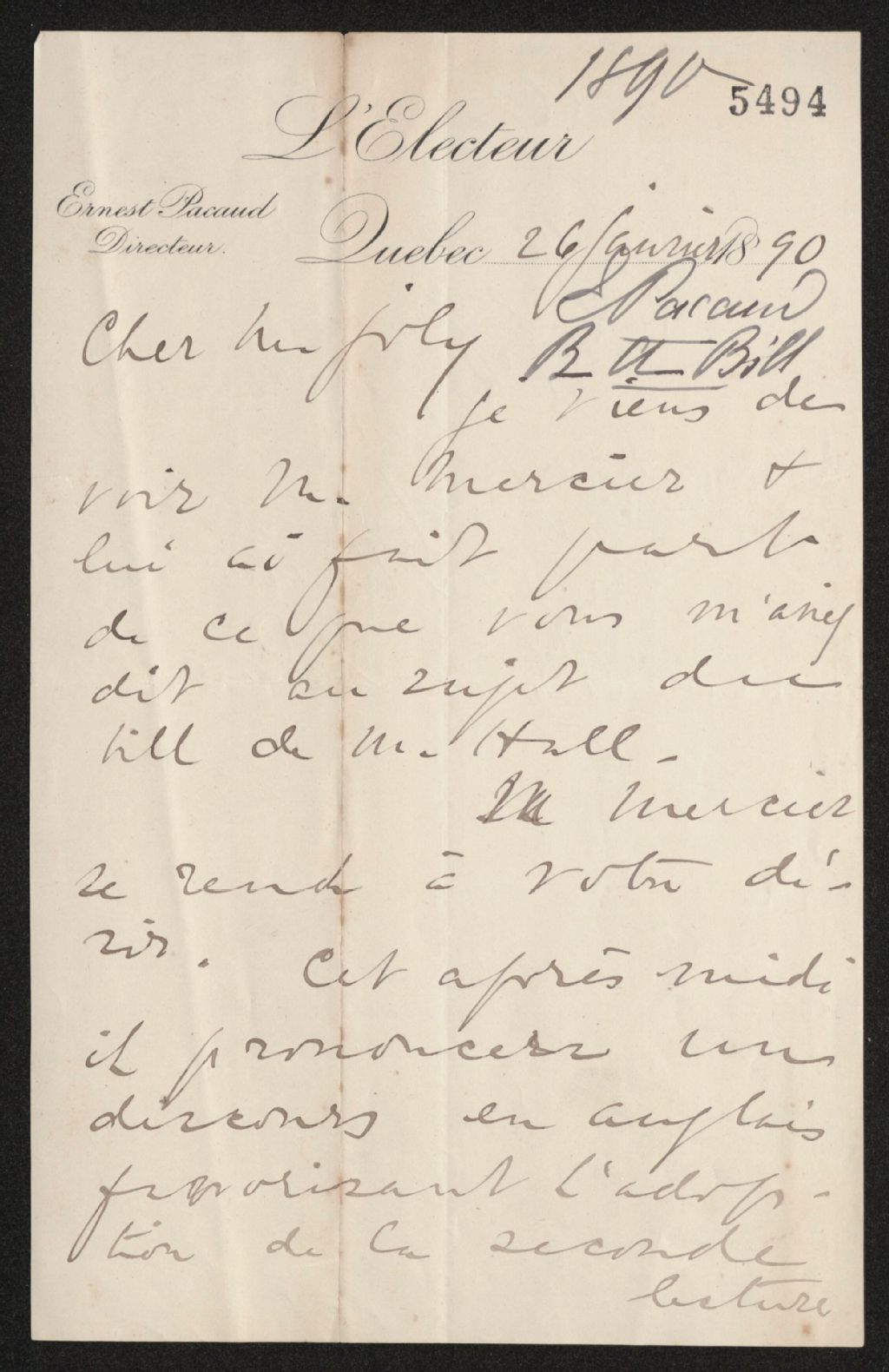 - Vient de voir Mercier et lui a fait les remarques de Joly au sujet du bill de Hall. Mercier se rend au désir de Joly. Cet après-midi, Mercier prononcera un discours favorisant l'adoption de la seconde lecture et il verra également à ce qu'il soit adopté au Conseil législatif