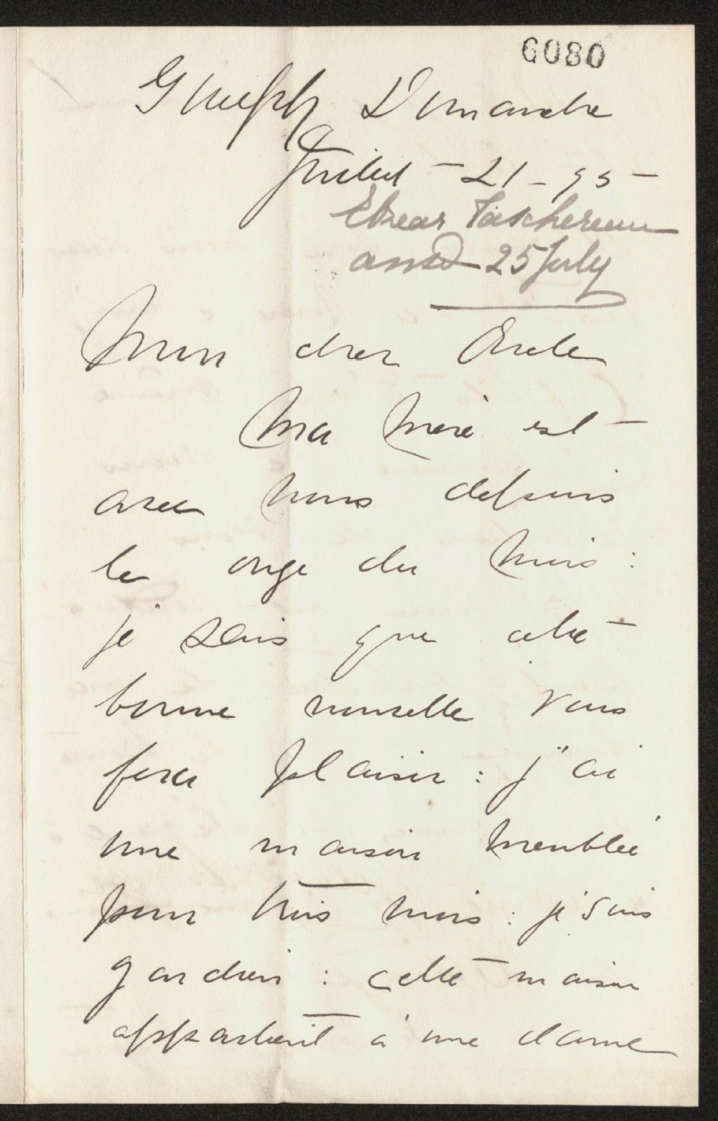 Lettre d'Elzéar R. A. Taschereau à Henri-Gustave Joly, 21 juillet 1895, Archives nationales à Québec, Fonds Famille Joly de Lotbinière, (03Q,P351,S4,SS1,P6080).