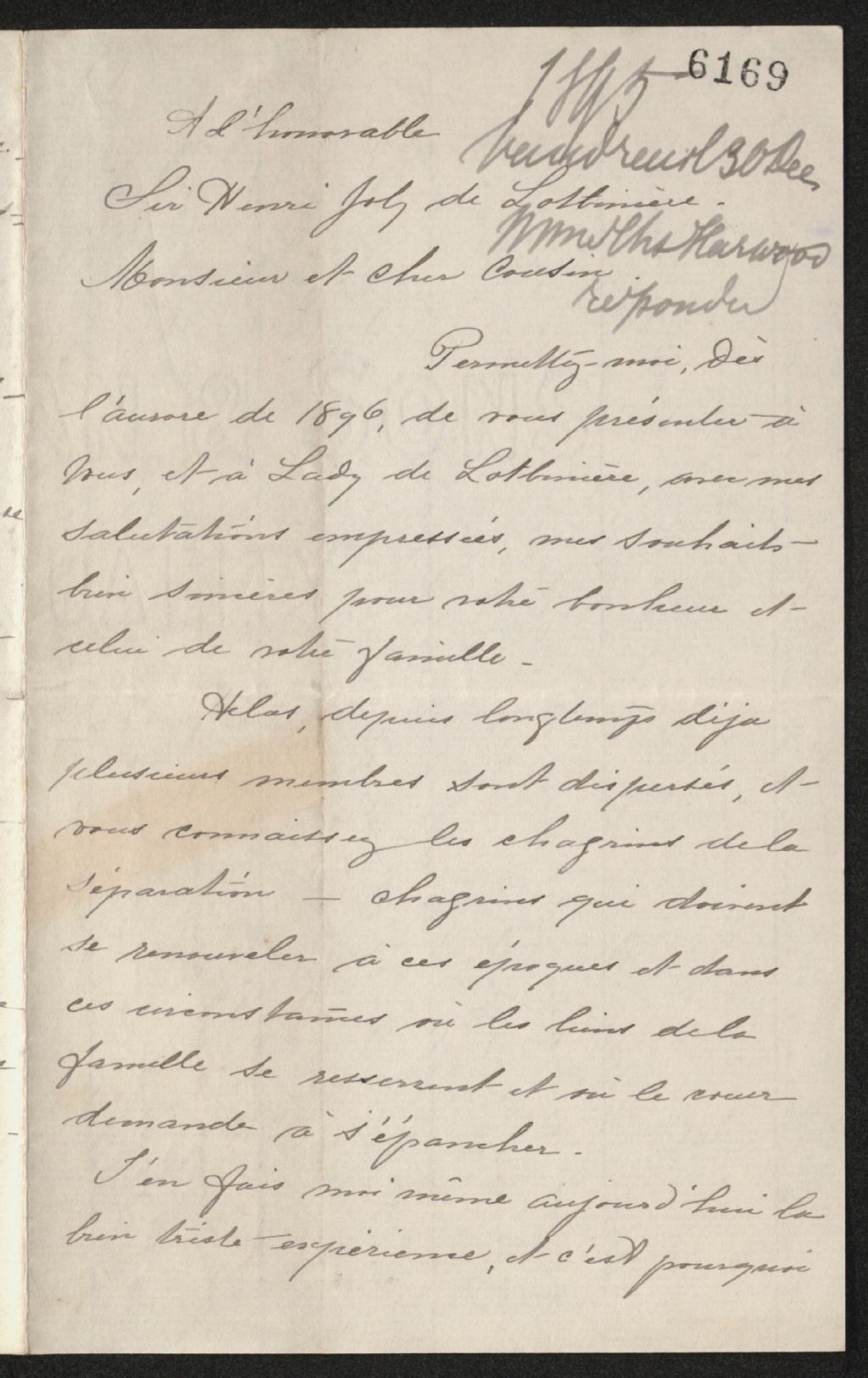Lettre de [Emma] Madame Charles Harwood à Henri-Gustave Joly