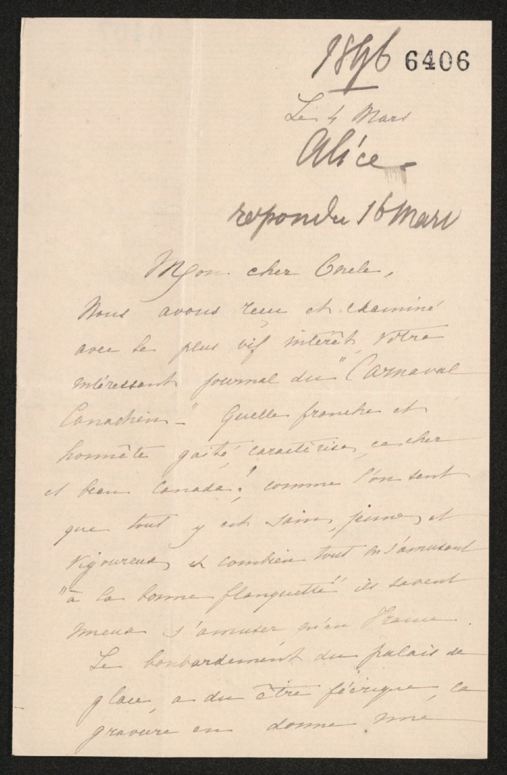 Lettre d'Alice de Coux à Henri-Gustave Joly