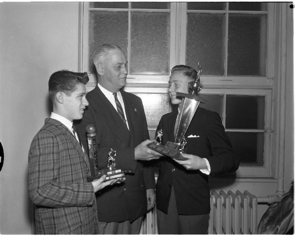 Remise de trophées à deux jeunes garçons à la Salle Légion d'Eastview, 28 mars 1963, Archives nationales à Gatineau, Fonds Champlain Marcil, (07H,P174,S1,D29982), Marcil, Champlain.