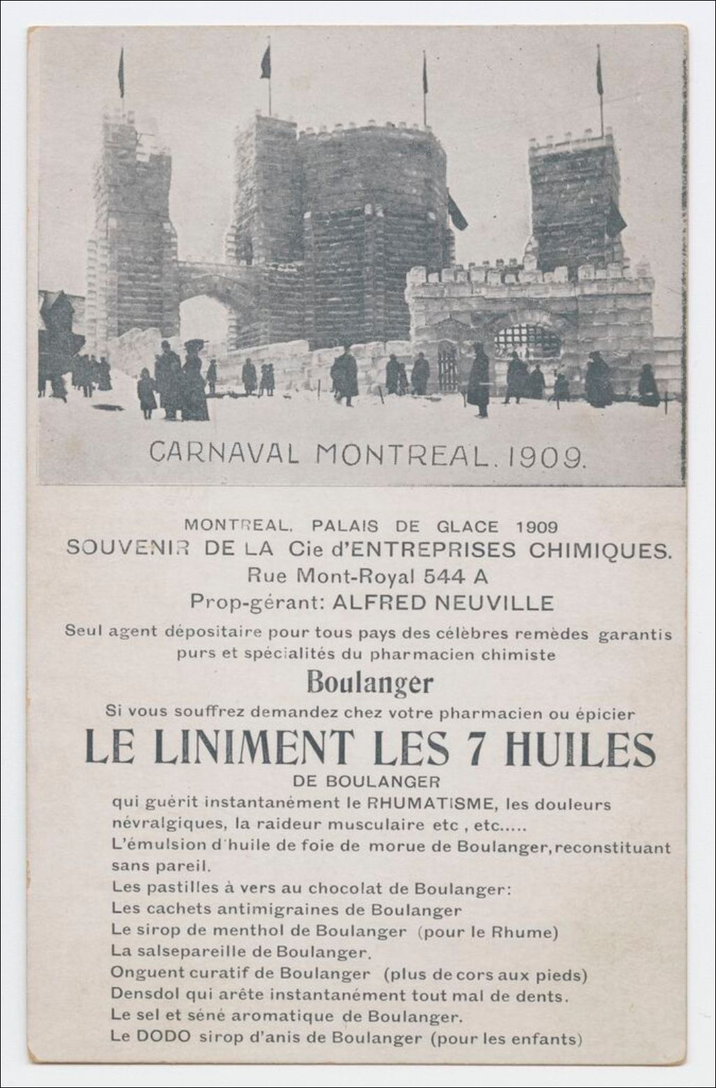 Montréal, palais de glace, 1909, souvenir de la Cie d'entreprises chimiques, rue Mont-Royal, 544 A, prop-gérant: Alfred Neuville ...