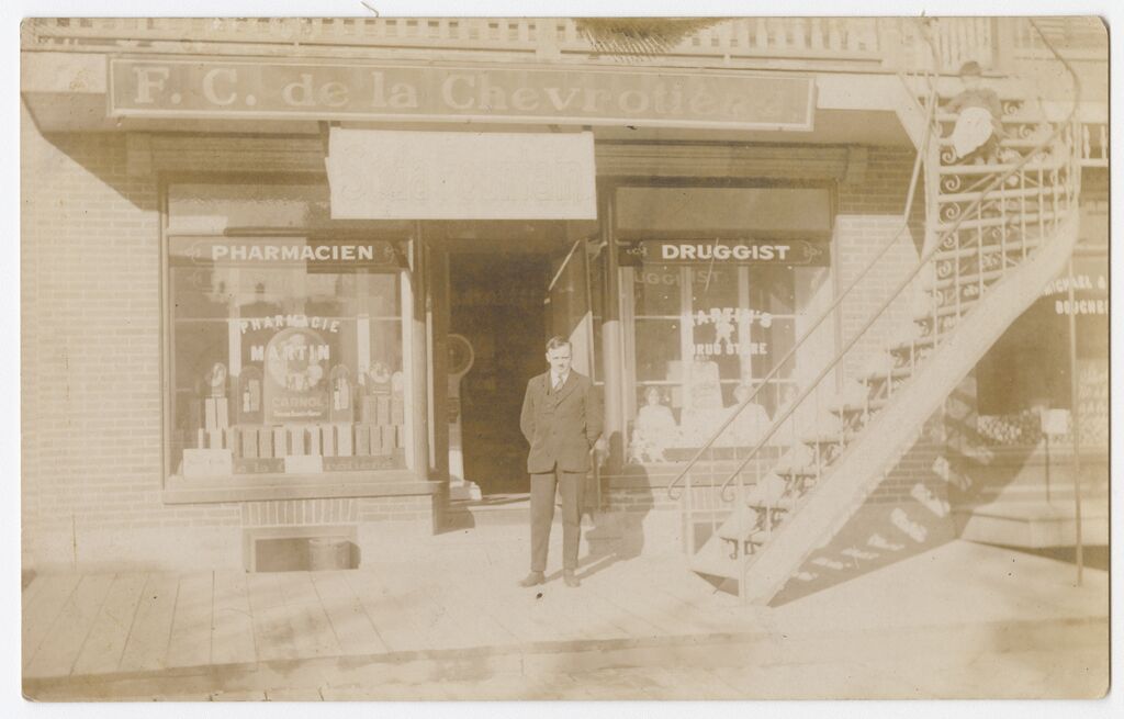 [Homme se tenant devant la pharmacie Martin, F.C. de la Chevrotière]