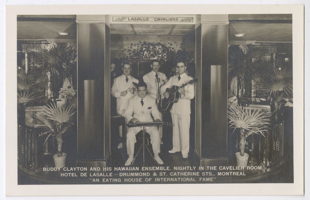 Buddy Clayton and his Hawaiian Ensemble, nightly in the Cavelier room : Hotel de LaSalle - Drummond & St. Catherine Sts., Montreal "An eating house of international fame"