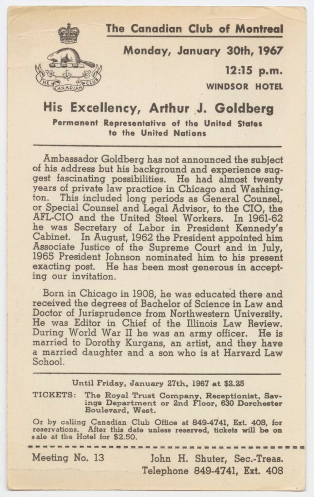The Canadian Club of Montreal : Monday, January 30th, 1967, 12:15 p.m. Windsor Hotel : His Excellency, Arthur J. Goldberg, Permanent Representative of the United States to the United Nations ...