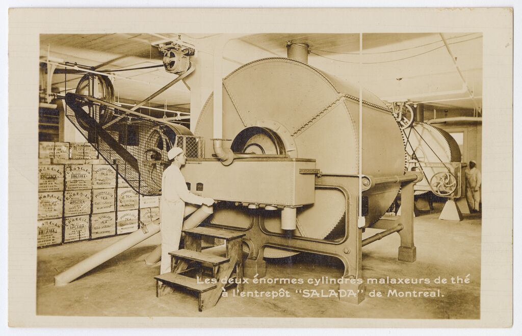 Les deux énormes cylindres malaxeurs de thé à l'entrepôt Salada de Montréal