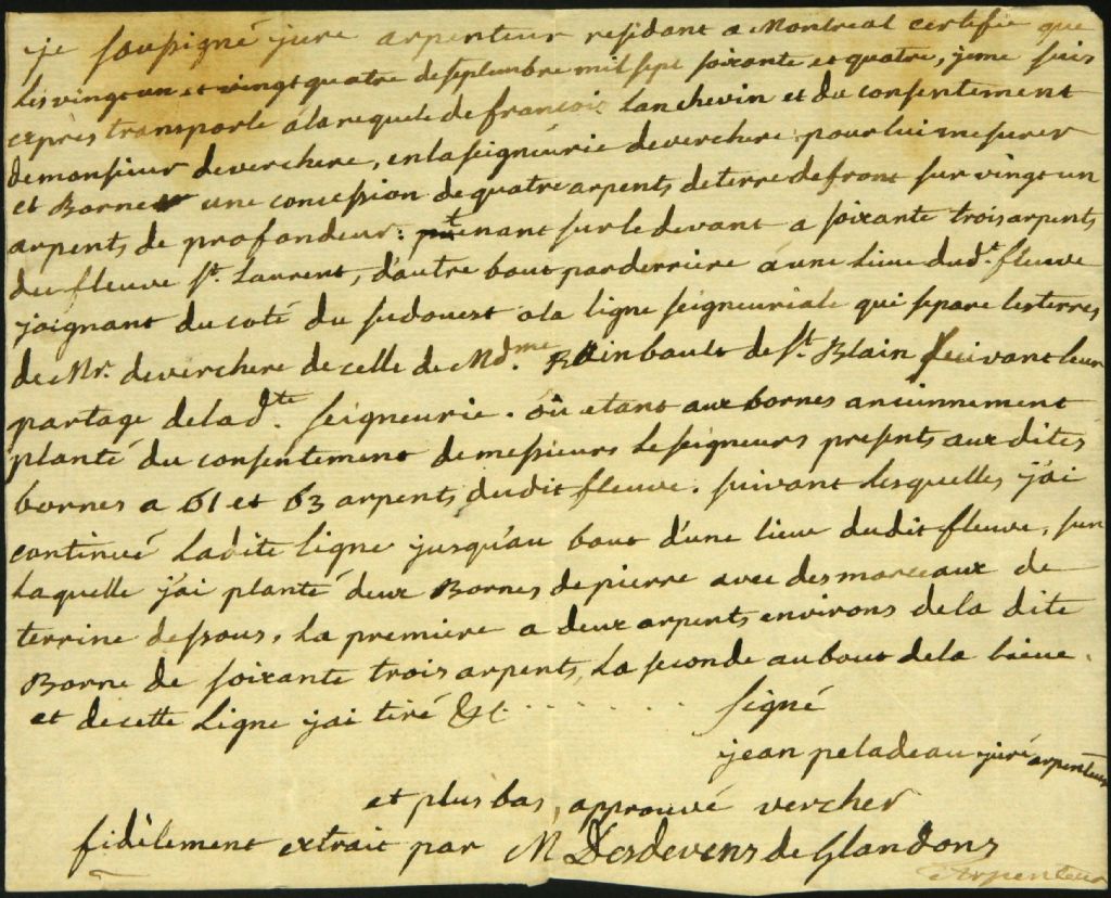 Procès-verbal de bornage et de mesurage, à la requête de François Lanchevin et à la suite du consentement de Monsieur de Verchères, d'une concession située dans la seigneurie de Verchères, 21 septembre 1764-24 septembre 1764, Archives nationales à Montréal, Fonds Cour supérieure. District judiciaire de Montréal. Greffes d'arpenteurs, (06M,CA601,S18,SS2,D3).