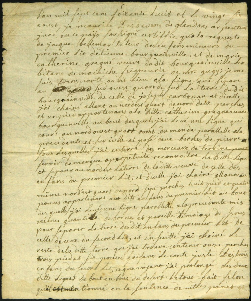 Procès-verbal d'arpentage et de bornage, à la requête de Jacque Bellemar, tuteur des enfants mineurs du premier lit de feu Étienne Bourgainville et de Marie Catherine Gagné, sa veuve, de Machiche, d'un emplacement situé au dit lieu, 26 août 1768, Archives nationales à Montréal, Fonds Cour supérieure. District judiciaire de Montréal. Greffes d'arpenteurs, (06M,CA601,S18,SS2,D23).