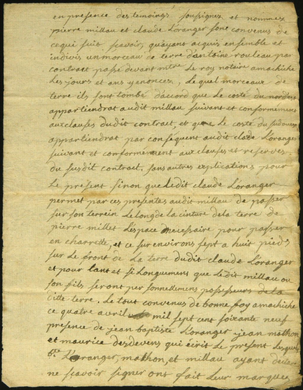 Séparation d'une terre appartenant à Pierre Millau et Claude Loranger à Machiche, 4 avril 1769, Archives nationales à Montréal, Fonds Cour supérieure. District judiciaire de Montréal. Greffes d'arpenteurs, (06M,CA601,S18,SS2,D33).