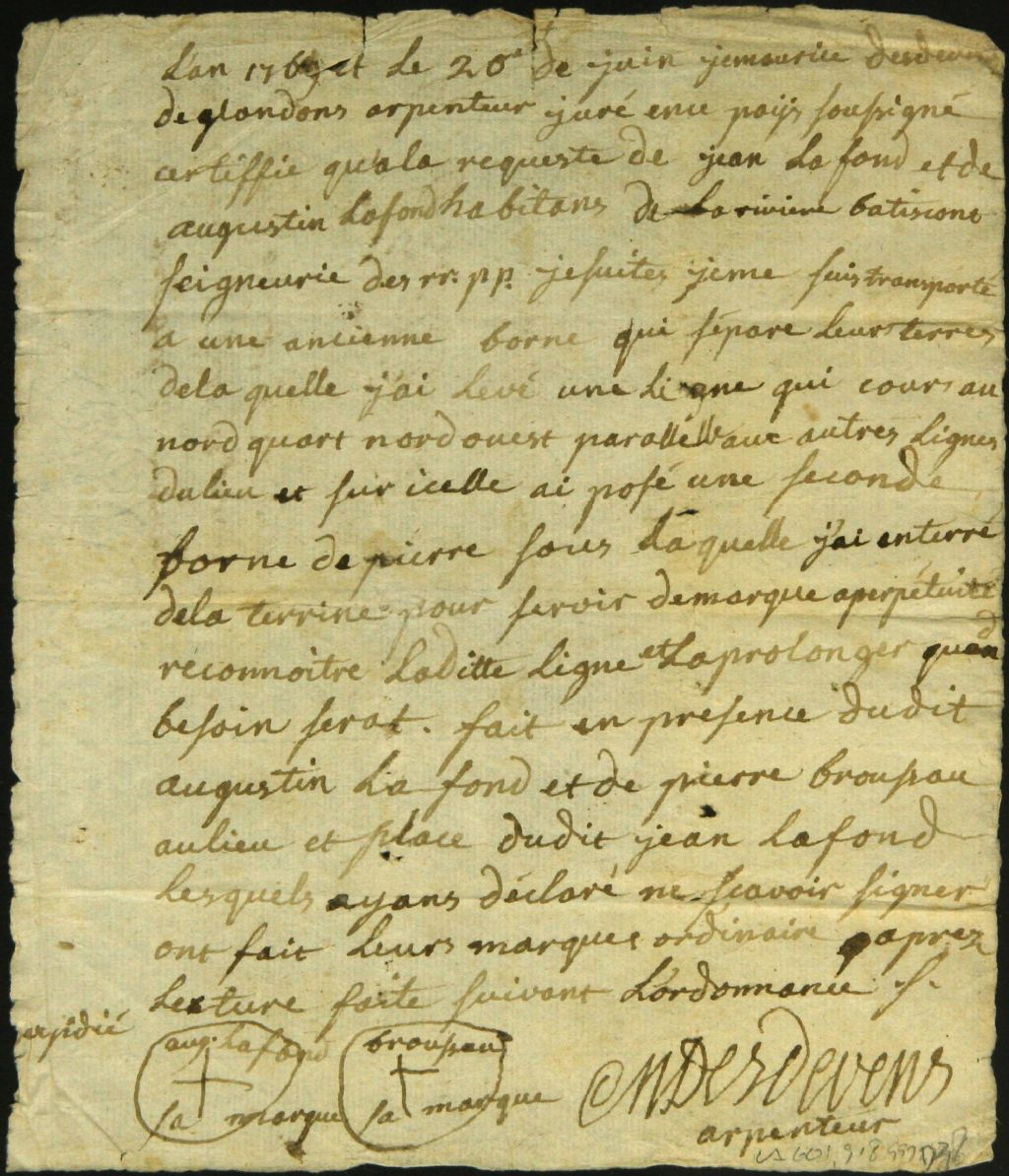 Procès-verbal de bornage, à la requête d'Augustin et Jean Lafond, d'un emplacement situé à la rivière Batiscan dans la seigneurie des Jésuites, 20 juin 1769, Archives nationales à Montréal, Fonds Cour supérieure. District judiciaire de Montréal. Greffes d'arpenteurs, (06M,CA601,S18,SS2,D38).