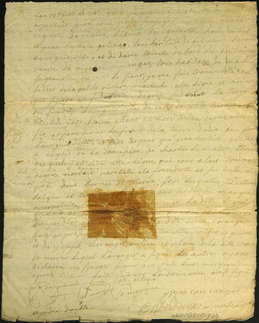 Procès-verbal d'arpentage et de bornage, à la requête de Pierre Gaillou, Jean Baptiste Gélinas et la veuve de Nicolas L'Oranger, de terres situées à Machiche, 30 octobre 1769, Archives nationales à Montréal, Fonds Cour supérieure. District judiciaire de Montréal. Greffes d'arpenteurs, (06M,CA601,S18,SS2,D63).