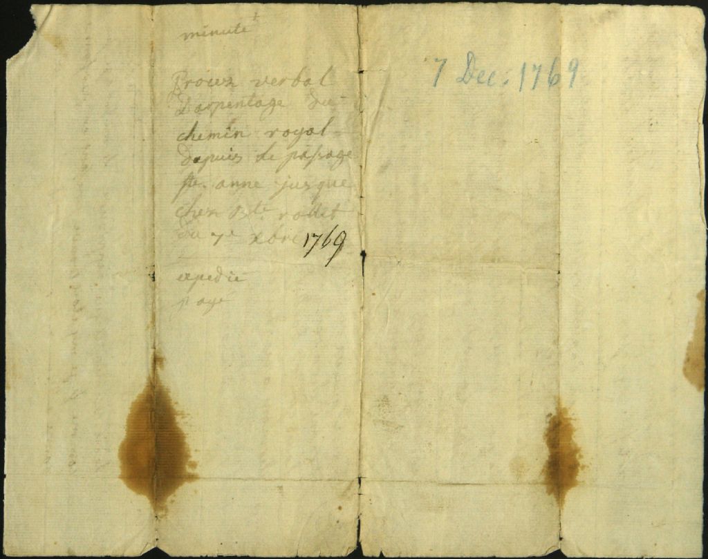 Procès-verbal d'arpentage, à la requête de François Baribeau et Jean Baptiste Rollet, tous deux maîtres de poste, du chemin Royal depuis l'embarquement du côté Est de la rivière Sainte-Anne jusque chez Monsieur Rollet à Grondines, 7 décembre 1769, Archives nationales à Montréal, Fonds Cour supérieure. District judiciaire de Montréal. Greffes d'arpenteurs, (06M,CA601,S18,SS2,D67).