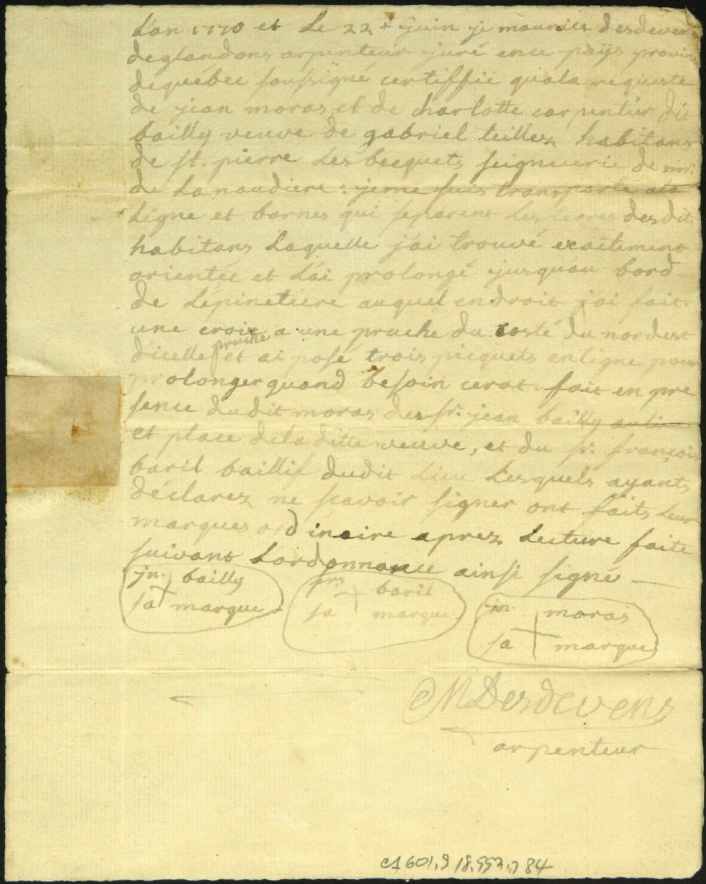 Procès-verbal d'arpentage, à la requête de Charlotte Carpentier dit Bailly, veuve de Gabriel Teiller, et Jean Moras, d'un emplacement situé à Saint-Pierre-les Becquets, seigneurie de Monsieur de Lanaudière, 22 juin 1770, Archives nationales à Montréal, Fonds Cour supérieure. District judiciaire de Montréal. Greffes d'arpenteurs, (06M,CA601,S18,SS2,D84).