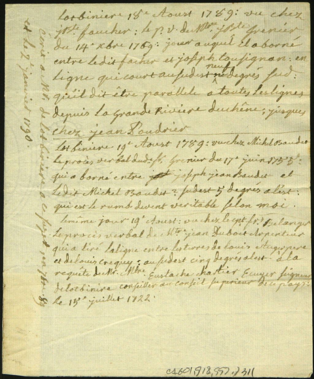 - Ce dossier fait aussi référence à un procès-verbal réalisé par l'arpenteur Jean-Baptiste Grenier le 14 octobre 1769