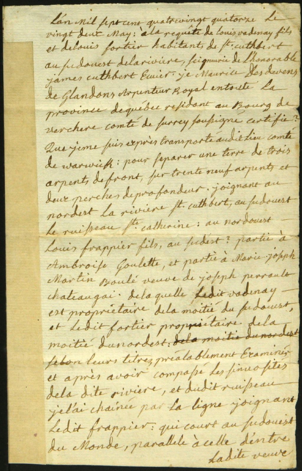 Procès-verbal d'arpentage, à la requête de Louis Fortier et Louis Vadenay, fils, d'un emplacement situé au Sud-Ouest de la rivière Saint-Cuthbert dans la seigneurie de James Cuthbert, 22 mai 1794, Archives nationales à Montréal, Fonds Cour supérieure. District judiciaire de Montréal. Greffes d'arpenteurs, (06M,CA601,S18,SS2,D432).