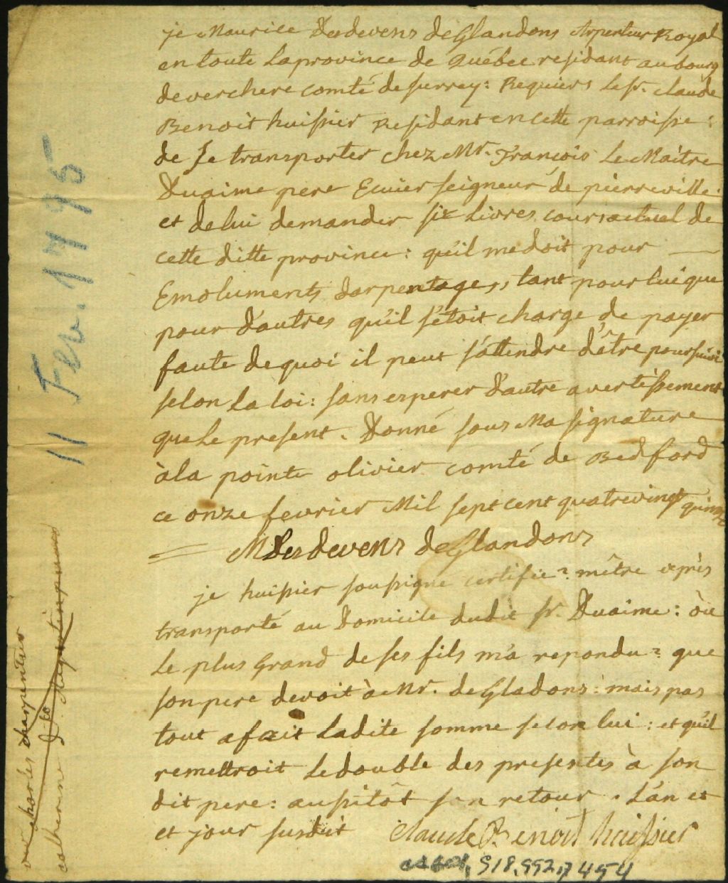 Sommation faite à François Lemaître Duaime, seigneur de Pierreville, par Maurice Desdevens de Glandon à propos d'une somme due, 11 février 1795, Archives nationales à Montréal, Fonds Cour supérieure. District judiciaire de Montréal. Greffes d'arpenteurs, (06M,CA601,S18,SS2,D454).