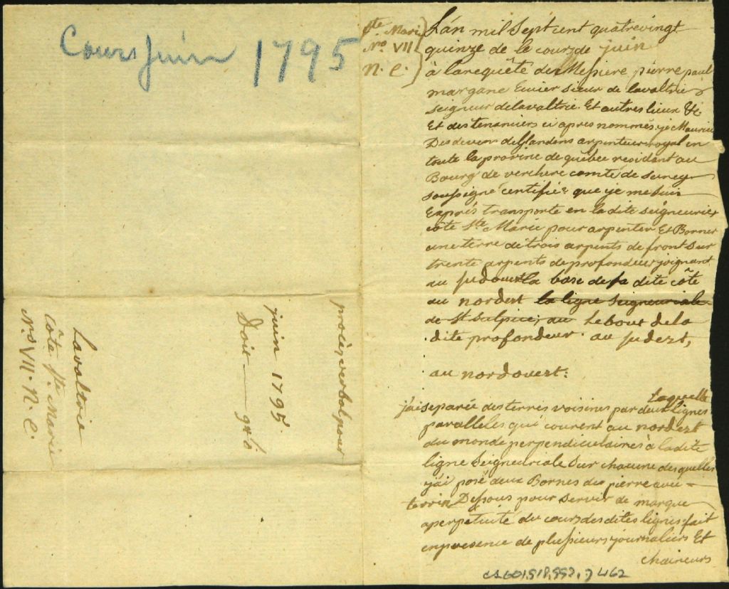 Procès-verbal d'arpentage et de bornage, à la requête de Pierre Paul Margane, seigneur de Lavaltrie, d'un emplacement situé à la côte Sainte-Marie dans la dite seigneurie (côté Nord-Est du n° 7), Juin 1795, Archives nationales à Montréal, Fonds Cour supérieure. District judiciaire de Montréal. Greffes d'arpenteurs, (06M,CA601,S18,SS2,D462).