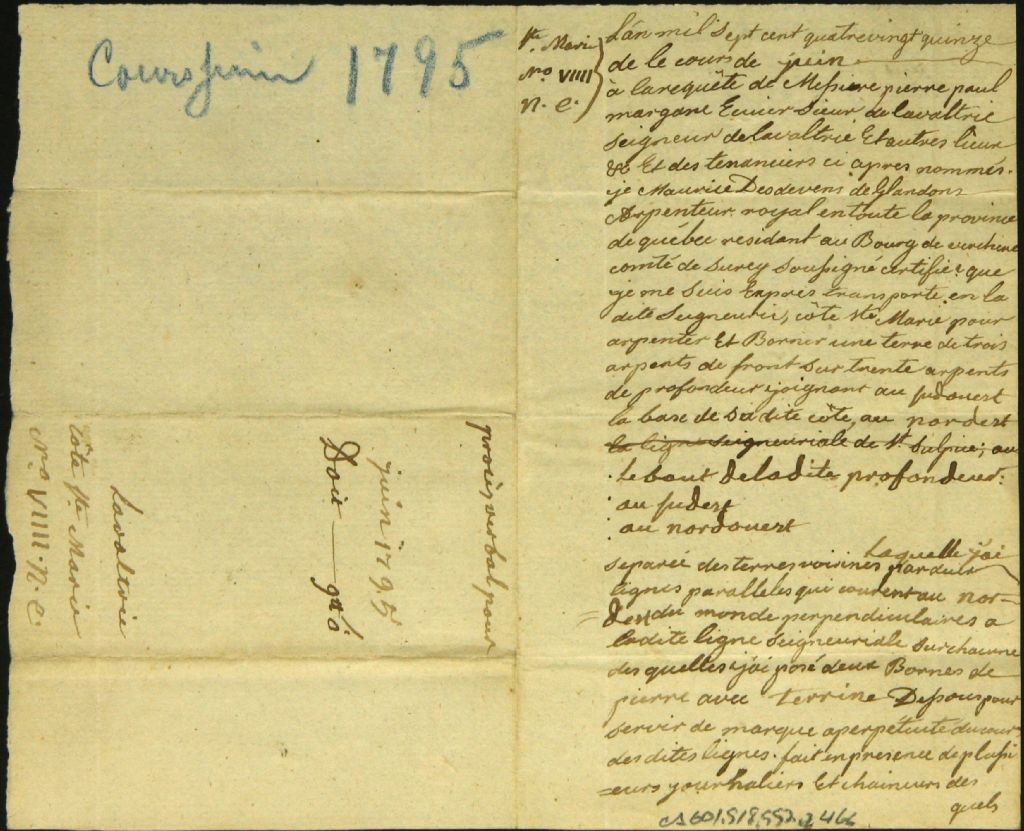 Procès-verbal d'arpentage et de bornage, à la requête de Pierre Paul Margane, seigneur de Lavaltrie, d'un emplacement situé à la côte Sainte-Marie dans la dite seigneurie (côté Nord-Est du n° 8), Juin 1795, Archives nationales à Montréal, Fonds Cour supérieure. District judiciaire de Montréal. Greffes d'arpenteurs, (06M,CA601,S18,SS2,D466).