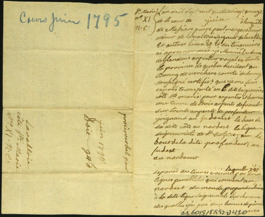 Procès-verbal d'arpentage et de bornage, à la requête de Pierre Paul Margane, seigneur de Lavaltrie, d'un emplacement situé à la côte Sainte-Marie dans la dite seigneurie (côté Nord-Est du n° 11), Juin 1795, Archives nationales à Montréal, Fonds Cour supérieure. District judiciaire de Montréal. Greffes d'arpenteurs, (06M,CA601,S18,SS2,D470).