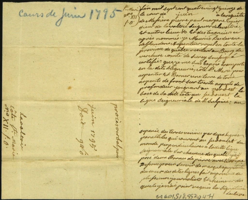 Procès-verbal d'arpentage et de bornage, à la requête de Pierre Paul Margane, seigneur de Lavaltrie, d'un emplacement situé à la côte Sainte-Marie dans la dite seigneurie (côté Sud-Ouest du n° 12), Juin 1795, Archives nationales à Montréal, Fonds Cour supérieure. District judiciaire de Montréal. Greffes d'arpenteurs, (06M,CA601,S18,SS2,D471).