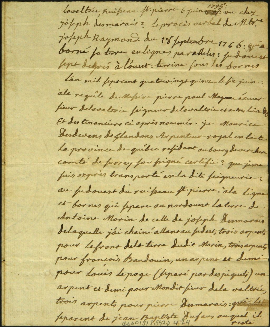 Procès-verbal de bornage, à la requête de Pierre Paul Margane, seigneur de Lavaltrie, des terres de François Baudouin, Pierre Desmarais, Jean Baptiste et Joseph Dufau, Louis Lepage, Antoine Morin et Jean Pascal Parent situées au Nord-Est et au Sud-Ouest du ruisseau Saint-Pierre dans la dite seigneurie, 6 juin 1795, Archives nationales à Montréal, Fonds Cour supérieure. District judiciaire de Montréal. Greffes d'arpenteurs, (06M,CA601,S18,SS2,D474).