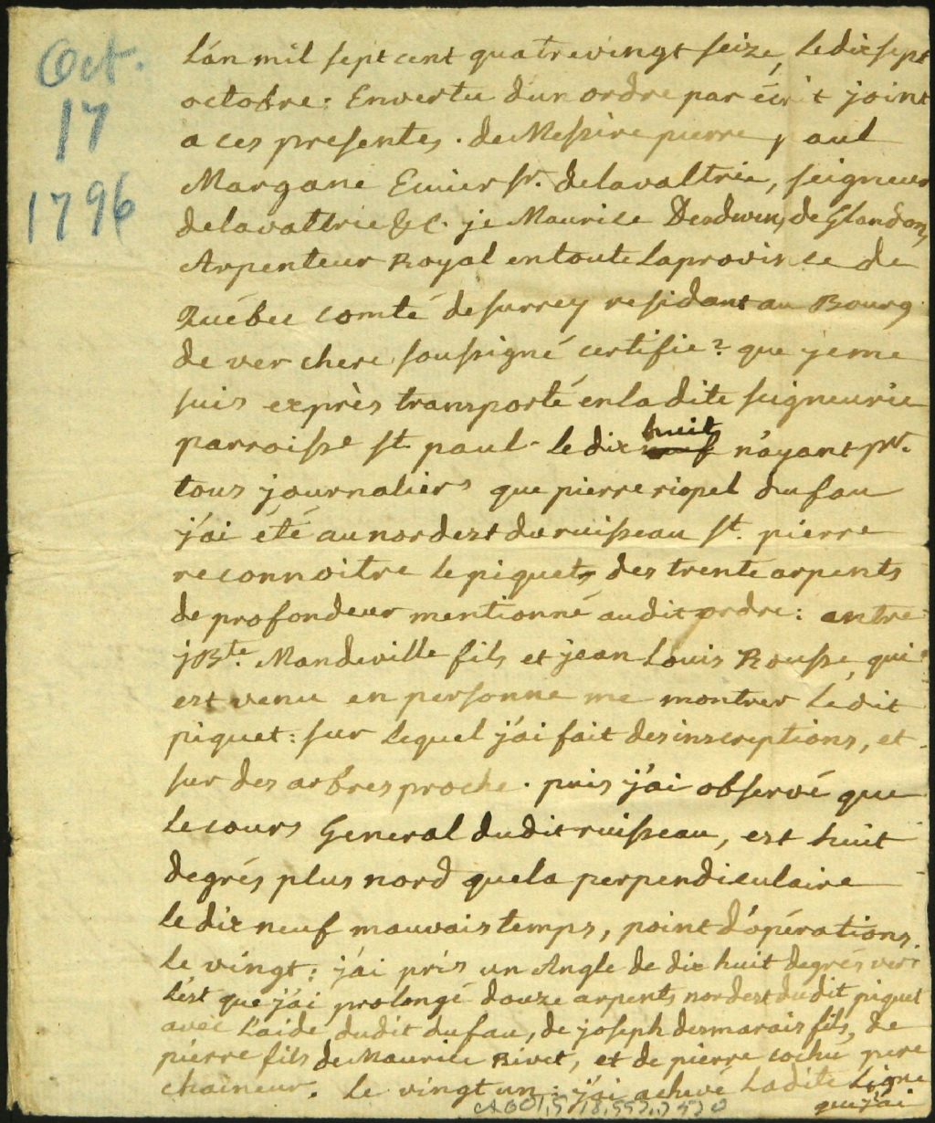 Procès-verbal de bornage, à la requête de Pierre Paul Margane, seigneur de Lavaltrie, de terres situées entre le ruisseau Saint-Pierre et la rivière l'Assomption dans la dite seigneurie, Octobre 1796-novembre 1796, Archives nationales à Montréal, Fonds Cour supérieure. District judiciaire de Montréal. Greffes d'arpenteurs, (06M,CA601,S18,SS2,D520).
