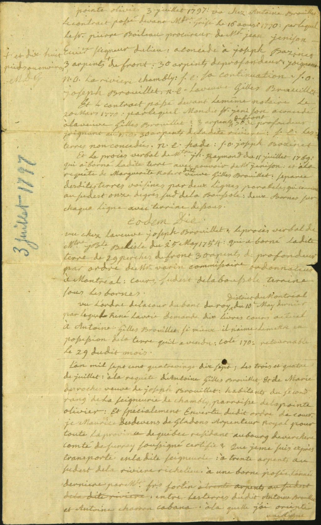 - Procès-verbal d'arpentage et de bornage des terres de Joseph Bazinet, Gilles Antoine et la veuve Joseph Brouillet situées à la Pointe-Olivier, dans le 2e Rang de la seigneurie de Chambly, au Sud-Est de la rivière Richelieu