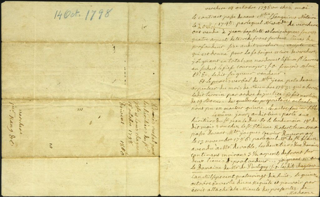 Procès-verbal de mesurage, à la requête de Mesdames Desauniers et de Rouville, des terres de Jean Baptiste et Louis Chagnon situées dans le 1er Rang de la seigneurie de Verchères, 15 octobre 1798, Archives nationales à Montréal, Fonds Cour supérieure. District judiciaire de Montréal. Greffes d'arpenteurs, (06M,CA601,S18,SS2,D551).