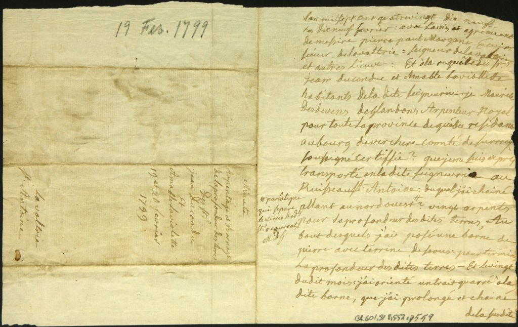Procès-verbal d'arpentage et de bornage, en vertu d'un ordre de Pierre Paul Margane, seigneur de Lavaltrie, et à la requête de Jean Ducondu et Amable Laviolette, d'un emplacement situé au ruisseau Saint-Antoine dans la dite seigneurie, 19 février 1799, Archives nationales à Montréal, Fonds Cour supérieure. District judiciaire de Montréal. Greffes d'arpenteurs, (06M,CA601,S18,SS2,D559).