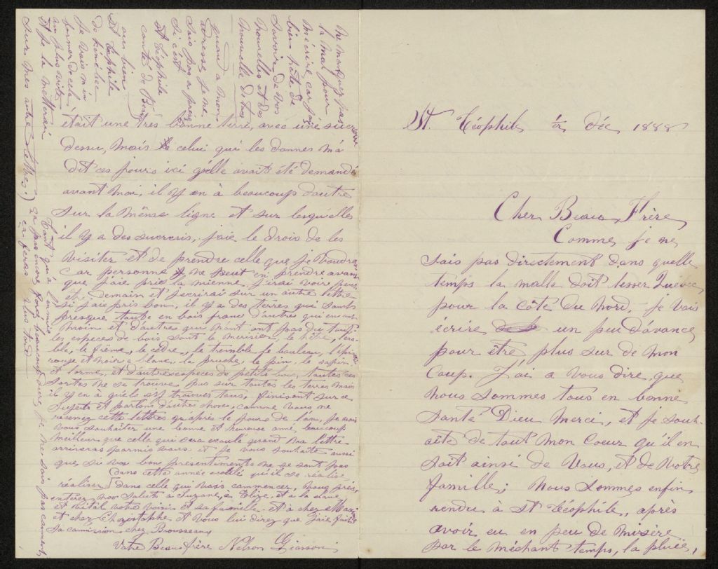 - Le dossier contient de la correspondance personnelle de Placide Vigneau en provenance de Nelson Giasson, beau-frère de Placide (marié à Marie-Anne Vigneau). Nelson Giasson quitta la Pointe-aux-Esquimaux pour Saint-Théophile de Beauce en 1888. Il fut d'ailleurs le premier maire de Saint-Théophile.La correspondance concerne des nouvelles générales (santé, famille, travail, chasse), arrivée à Saint-Théophile (description du village et des terres), le travail (salaires, le travail en chantier, le travail aux États-Unis), mort d'Henri Chevarie (fils d'Auguste Chevarie) après s'être perdu dans le bois pendant une partie de chasse, le décès de Victoire Doyle, construction de l'église de Saint-Côme.