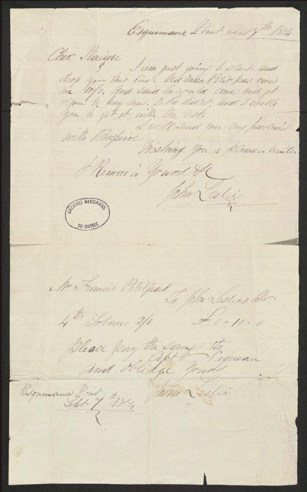 - Le dossier contient de la correspondance personnelle de la famille de Placide Vigneau en provenance du capitaine John Leslie de Spry Harbour, Nouvelle-Écosse, venu à la Pointe-aux-Esquimaux pour la chasse aux loups-marins dès 1862. Les lettres, adressées à Vital et Placide Vigneau, concernent des nouvelles générales sur la navigation, la vente de biens aux Îles-de-la-Madeleine, la pêche, projets d'aller à Québec et un montant d'argent que lui doit François Petitpas pour l'achat de tabac.