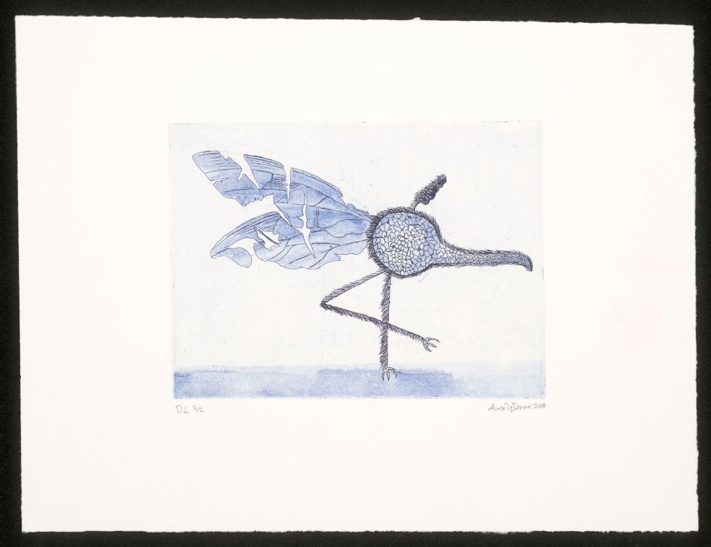 1 estampe : eau-forte avec teinte de fond, encre bleue et noire, sur papier vélin crème ; cuvette 15 x 21 cm