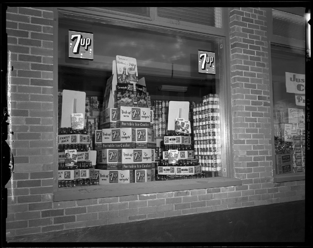 Vitrine La Ménagère - Liqueur 7Up, 3 août 1954, Archives nationales à Rimouski, Fonds J.-Gérard Lacombe, (01R,P24,S3,SS7,D285), J.-Gérard Lacombe.