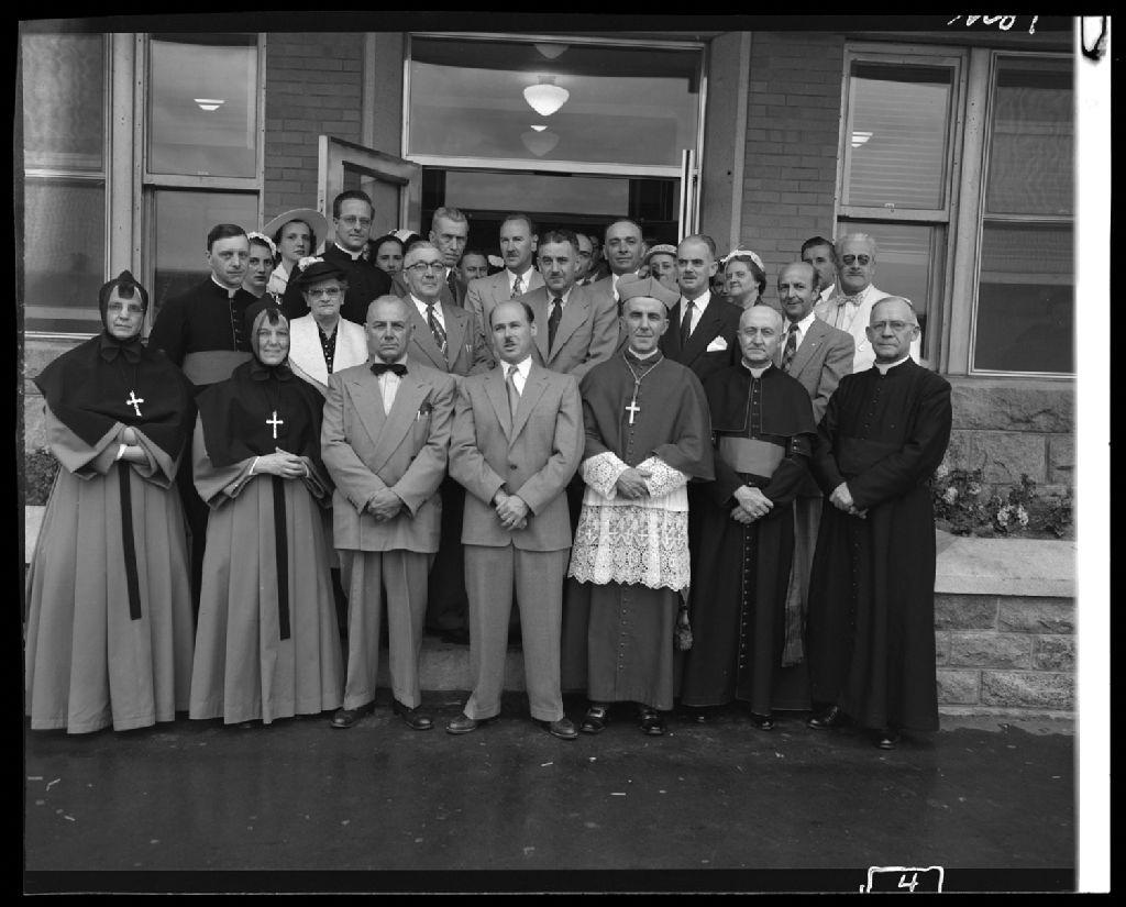 Mgr Parent et un groupe de personne à la bénédiction de l'Hôpital de Rimouski, 27 juin 1954, Archives nationales à Rimouski, Fonds J.-Gérard Lacombe, (01R,P24,S3,SS7,D272,P1), J.-Gérard Lacombe.
