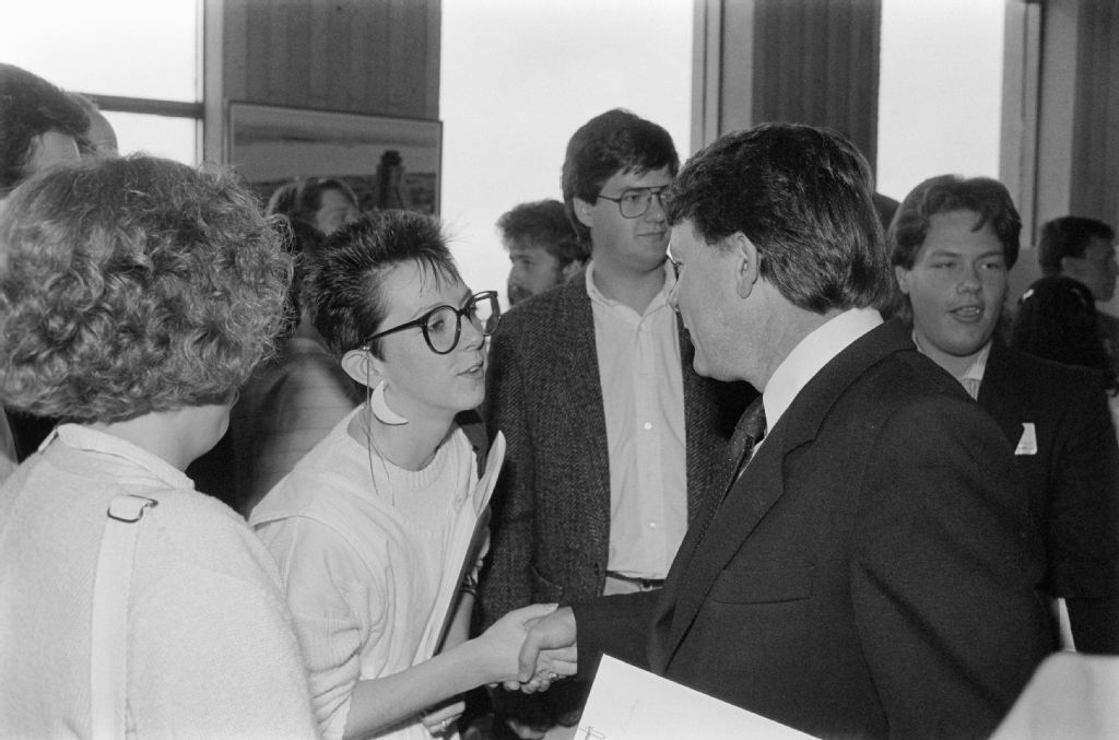 Conférence de presse du ministre des Relations internationales, Bernard Landry, pour l'Année internationale de la jeunesse, 1985, 18 juin 1985, Archives nationales à Québec, Fonds Ministère des Communications, (03Q,E10,S44,SS1,D85-431), Marc Lajoie.