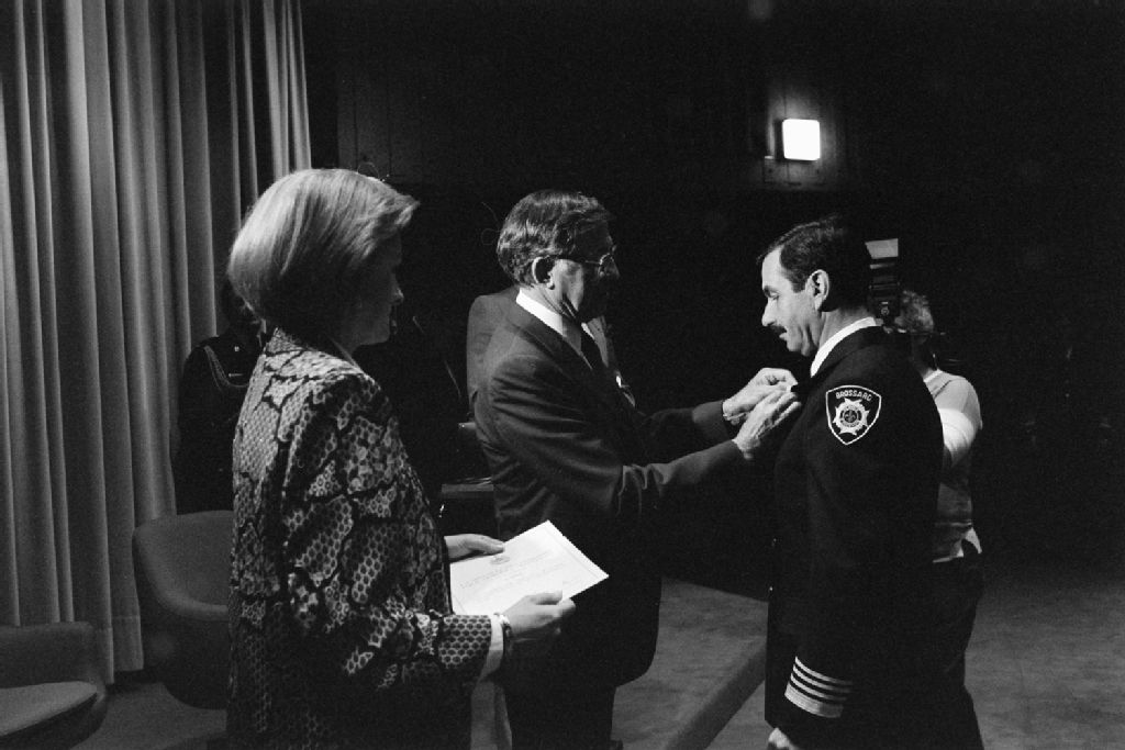 Remise de médailles d'honneur à 50 pompiers par le Lieutenant-gouverneur, Gilles Lamontagne et Violette Trépanier, députée de Dorion
