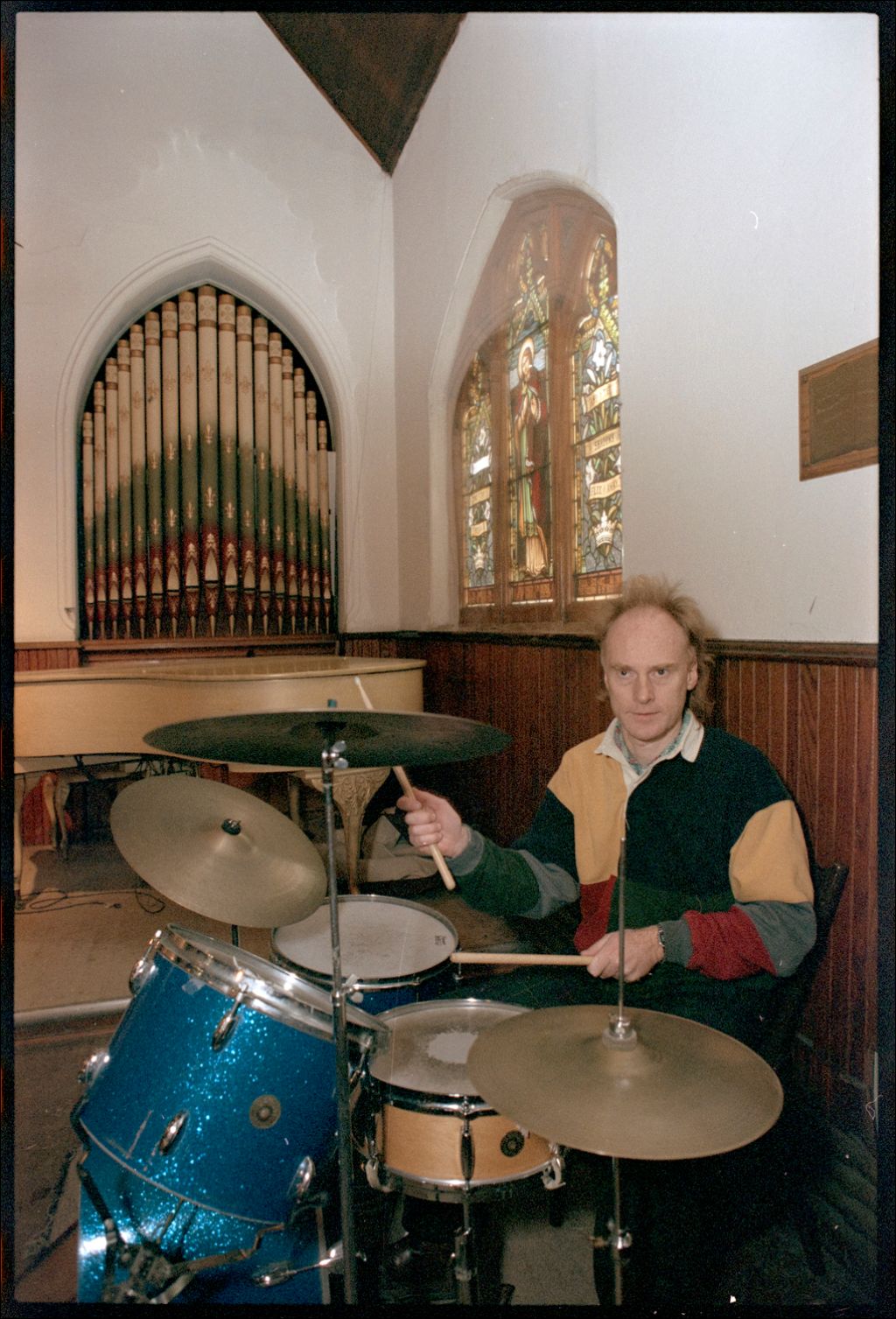 - Le dossier contient des photoreportages sur le thème de l'église. Il comprend une épreuve de la fête de l'Assomption, des épreuves de la cathédrale Marie-Reine-du-Monde et des négatifs d'un curé jouant de la batterie dans son église.