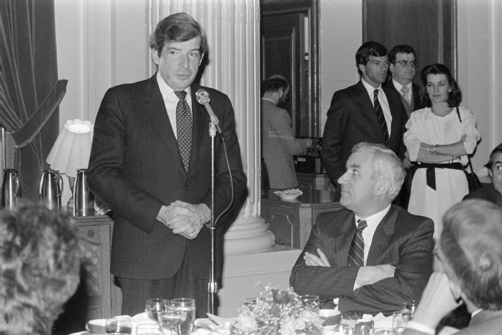 Réception pour souligner le 100e anniversaire de la première séance de l'Assemblée Nationale. Furent présents : Monsieur Richard Guay, président de l'Assemblée Nationale, Monsieur Jean Pelletier, maire de Québec, et Monsieur Gérard-D. Lévesque de l'opposition officielle., 27 mars 1984, Archives nationales à Québec, Fonds Ministère des Communications, (03Q,E10,S44,SS1,D84-163), Marc Lajoie.